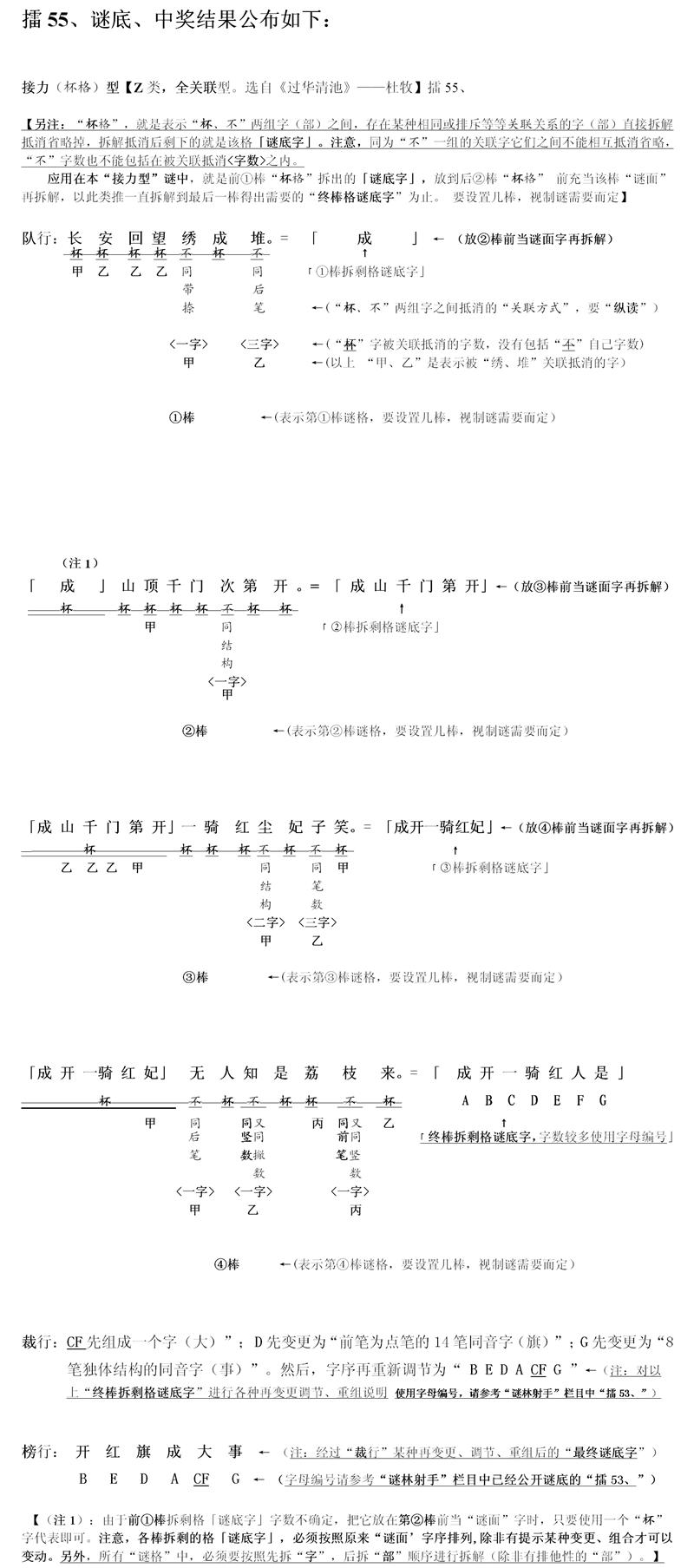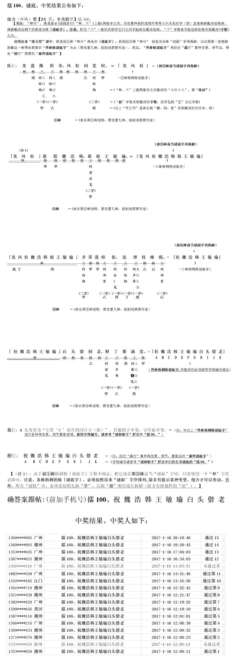 第一名:甲级奖谜书(原始分红式股东),奖金500元。获奖人,余晓容(网名,水中月),福建省福州市永泰县人。手机1850****008。