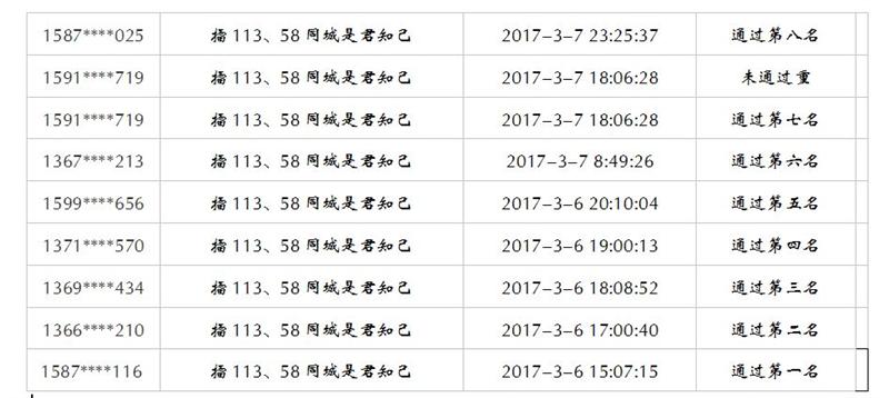 | 1366****210广州 | 消擂121、无限风光红花郎 | 2017-4-4 9:54:50 | 通过第四 | |